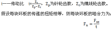 在這里擺線針輪輪齒的受力情況作一個簡化。因輪齒上受到的力均通過擺線輪的節圓上的一點,故可能所有輪齒受到的力簡化成為一個合力,與擺線輪齒運動方向的夾角為α′(即嚙合角)。見圖3.4。