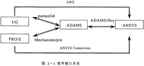 以上四個軟件均是當今比較流行且功能強大的大型CAD/CAE軟件,然而考慮到ADAMS的內核就是Parasolid,從UG中導入ADAMS的模型包含了在UG里定義的密度、質量等幾何屬性,不需作任何變更就可使用;而PRO/E與ADAMS間通過Mechanism/pro模塊進行連接時存在較多的問題,經過長時間的摸索才連通,且發現在PRO/E里南非先將各個零件定義為剛體,作為子裝配只能定義為一個剛體,可是像RV減速器這樣的大模型在裝配過程中不可避免地含有子裝配并且子裝配中的零件間有相對運動,將其定義為一個剛體是錯誤的,為此,本課題中采用了UG、ADAMS與ANSYS形成的分析平臺。