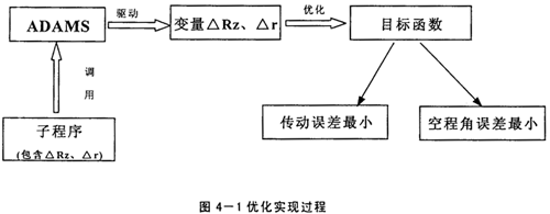 上已述及,擺線輪修形方式及修形量的選擇對RV減速器傳動誤差及空程角誤差的影響很大,因此進行優化分析應將傳動誤差及空程角誤差作為目標函數,而將移距修形量△Rz及等距修形量△r作為設計變量,且△Rz與△r的正、負號表明了修形方式,子程序又是建立擺線輪的通用齒廓方程,通過ADAMS對子程序的調用,就可得到最優的修形組合。具體的實現過程如下圖所示: