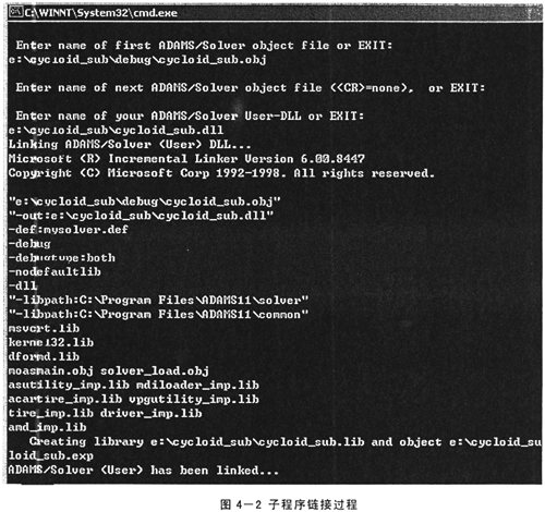 5)在背景模式(即命令提示模式)下,將上一步的目標文件與ADAMS鏈接,生成可執行的用戶庫(*.dll)。