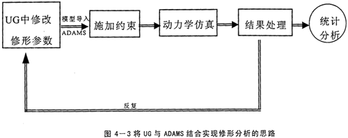 前面已經以擺線傳輸線的參數化建模為例,闡述了UG的強大的基于特征的參數化造型功能,既然用子程序的方式實現不了,將UG的該功能加以充分利用,也可以實現優化修形的目的。實現的途徑是在建造擺線輪的表達式中考慮修形量△Rz與△r,這樣就建造了修形后的擺線輪,同時△Rz與△r是隨機可調的變量,可以得到任意組合的修形方式。并且UG的數據存儲具有單一數據庫的特點,零件圖中修改后,裝配圖及工程圖全都自動更新,不用人工去費時修改。然后,再將總裝配模型導入到ADAMS中施加約束。執行仿真。這樣就得到多組修形組合的仿真結果,經過統計分析就可得到最佳的修形組合。具體思路如下圖所示。