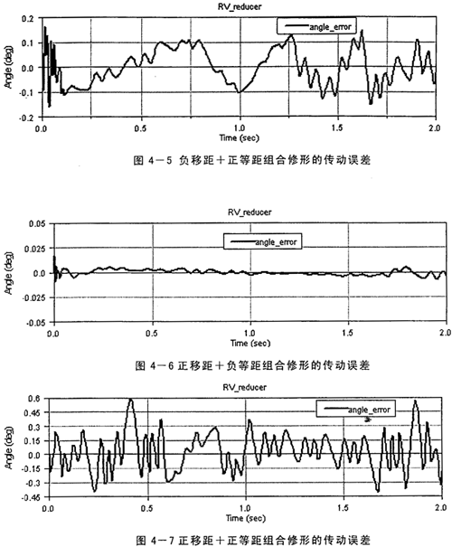 其中,θer——角度運動誤差,θin——任意時刻輸入軸轉角,i——傳動比,θout——輸出軸轉角。由于加工誤差、輪齒修形的原因引起瞬時傳動比的變化,必然出現傳動誤差,產生運動的不平穩性。在RV減速器中,漸開線齒輪嚙合在前級,后級是擺線針輪傳動,由于后級的傳動比一般約是前級的4~30倍,前級的漸開線齒輪的傳動誤差將被縮小同樣的倍數后輸出,所以其傳動誤差關鍵取決于后級的擺線針輪的嚙合誤差,而實際工作中擺線輪的修形方式及修形量的選擇是影響擺線針輪的嚙合誤差很大的因素。因此本課題中僅研究了輪齒修形對傳動誤差的影響,所采用的修形量以及得到的傳動誤差大小如表4-1所示,限于篇幅,對于負移距+正等距、正移距+負等距和正移距+正等距組合修形的傳動誤差仿真結果曲線各只列出一組(圖4-5、4-6、4-7)。