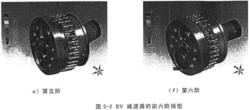 對上圖有限元模型進行模態(tài)計算時不必求出全部的固有頻率和振型,越是低價模態(tài),對振動影響越大,通常取前5~10階模態(tài),精度就已足夠。本課題在分析中求解了前11階模態(tài),這些模態(tài)的固頻率和振型情況見表5-1,圖5-2僅給出減速器的前6階固有振型,通過振型圖和各階振型的動畫顯示,可直觀地分析RV減速器的動態(tài)特性。