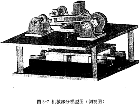 如圖5-1所示為實(shí)驗(yàn)系統(tǒng)機(jī)械部分的模型圖片,為了顯示清楚,沒(méi)有配置外邊的機(jī)箱,整個(gè)機(jī)構(gòu)是完全開(kāi)放式的,這樣也便于實(shí)驗(yàn)觀察。該機(jī)械結(jié)構(gòu)由上下兩個(gè)機(jī)架支撐,和前面的原理圖不同,下邊機(jī)架上放置昆旋導(dǎo)軌構(gòu)件(未顯示伺服電機(jī)),上邊機(jī)架則是上圖所示的其余連桿機(jī)構(gòu)及其支撐架、軸承等(未顯示常速電機(jī))。