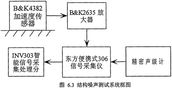 在測試產對所有的加速度傳感器,放大器及數據自動采集處理系統進行校準,對規定的所有測點進行打磨,平磨并做好標記,測試時在規定工況下依次將傳感器磁性底座放在各測點上。傳感器測得的振動信號(包括速度級和加速度級振動信號)經電荷放大器放大后進入16通道卡式采集儀進行采集記錄,用智能動態信號分析儀分析各測點的1/3倍頻程度級結構噪聲,再對所有的測點的結構噪聲值做對數平均,得到總的結構噪聲頻譜圖。空氣噪聲用聲級計測量減速裝置各個測點的A計權聲壓級和1/1倍頻程聲壓級。各測點距齒輪箱測量表面的距離為1米。測試前已用標準噪聲源HY203-93260對聲級計進行校準。測試系統框圖如圖6.3所示。測試設備如下: