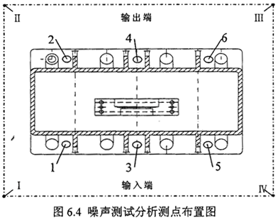 結構振動噪聲測試在齒輪箱安裝基腳布置6個測點,測點布置圖見圖3中1-6測點,在每一測點上按31.5Hz~5kHz1/3倍頻中心頻率測試加速度級頻譜(re:a0=10-6m/s)和1/3倍頻中心頻率測試速度級頻譜(re:a0=5*10-8m/s)?諝庠肼暅y試聲壓級基準2*10-5Pa,用聲級計上的A計權聲壓級和1/1倍頻程聲壓級測量減速齒輪裝置各個測點。各測點距齒箱測量表面的距離為1米。測點位置見測點布置圖6.4中Ⅰ-Ⅳ測點。