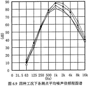 圖6.9為四種工況平均空氣噪聲倍頻程圖譜。由于減速齒輪裝置只是整個試驗系統的一部分,在測試時,發聲系統除齒輪箱外,還包括電動機、風機及車間內其它相鄰設備等背景噪聲源,它們將影響減速齒輪裝置的噪聲測量結果?紤]這些影響,根據國家標準《齒輪裝置噪聲聲功率級測定方法》(GB6404-1986)的規定,按各測點上測得的1/1倍頻程聲壓級做對數平均,然后進行修正,以得到實際的1/1倍頻程聲壓級空氣噪聲值。圖6.9為修正后的齒輪減速裝置的倍頻程平均空氣噪聲圖譜。表3為各測點A 聲級空氣噪聲值
