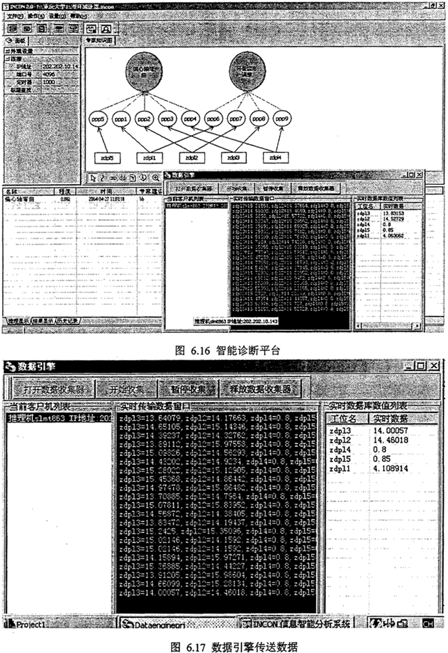 綜上分析,采用人機交互方式將Zdp14、Zdp15等參數輸入計算機,智能診斷系統得到雙環減速器故障診斷結果,偏心軸彎曲故障,程度值在0~1范圍變化,齒形誤差較大。智能診斷結果如圖6.15所示。圖6.16是智能診斷平臺進行現場一線診斷分析,圖6.17是數據引擎進行實時數據接收和數據發送。