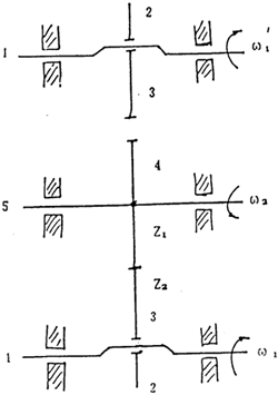 三環減速器實質上就是一種雙曲柄輸入式、內齒輪作圓周平動而外齒輪用于輸出的少齒差行星齒輪傳動機構。原理如圖2-1所示。雙曲柄機構1-1以轉速ω1輸入運動,通過連桿2及與連桿相固連的內齒輪了將運動傳給外齒輪4,并通過外齒輪4將運動傳遞給5ω2輸出運動和動力,其傳動比為: