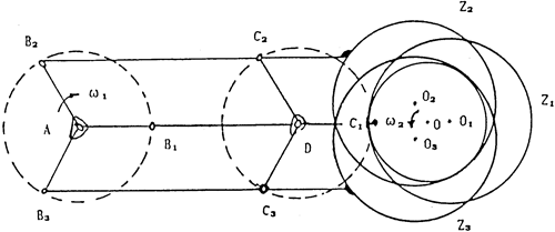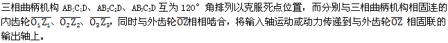 眾所周知,雙曲柄機構的最大缺點就是存在死點位置,即當曲柄,與連桿共線時,機構處理運動不確定位置,其傳動角為零,機械無法運動。為了克服死點位置,目前已出現了三種解決方法:其一是在同一行星輪上布置多套雙曲柄機構的方法:其二是采用雙曲柄動力輸入式方法;基三是采用多相并列式雙曲柄機構來克服死點的方法。三環減速器就是用三相并列雙曲柄機構來克服死點位置,如圖2-2所示。