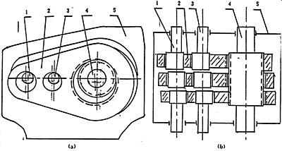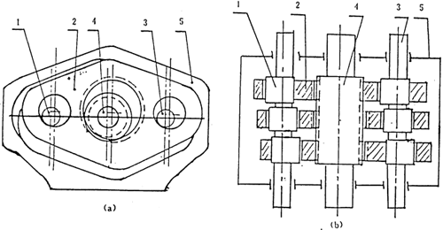 101型三環減速器基本構造如圖2-4(a)(b)所示。其輸出軸4位于輸入軸1和支承軸3之間,受力情況要優于110型三環減速器。