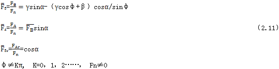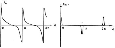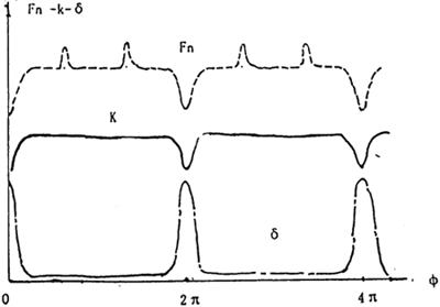 理論上,該力僅在ф=Kπ點產生,而FA、FB將在此點處趨于無窮大?紤]實際結構的彈性變形等因素,FBr應在ф=Kπ的一轉角領域內ф=Kπ±△ф產生,而FB、FA在該鄰域內由正(或負)向峰值過零轉變為負(正)向峰值,如圖2-10所示。這是因為FB、FA在死點位置附近迅速增大產生的彈性變形也會使環板產生微小反轉角度,而導致FBr的產生,顯然該微小角度領域的大小以及FB、FA所能達到的峰值決于環板的剛度。剛度越大,該領域越小,FB、FA峰值越大,FBr的大小與嚙合力及無量綱參數(γ+β)成正比。一般情況下,高速重載的三環減速器、環板機構的剛度嚙合力等均較大,因此死點處受到的沖擊越大,且沖擊脈沖寬度。ǚ幢扔诮撬俣龋ふ耦l率更寬,更易激起廣泛的共振。