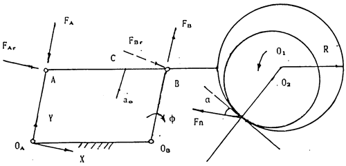 因Fn(Kπ)≠0,則當環板機構過死點位置時,該雙軸柄機構將在嚙合力Fn與輸入軸驅動力FAr的作用下產生反轉力矩,有可能在機構的該運動狀態的不確定位置ф=Kπ處由正向雙曲柄機構變成反向雙曲柄機構,而在此時,另兩套雙曲柄機構將通過轉臂軸與偏心套的鍵聯接處產生推動該環板過死點位置的作用力,克服其反轉,從而產生沖擊力FBr,否則FB、FA將趨向于無窮大,其物理意義為機構不可能通過死點。顯然,在ф=Kπ的死點位置的微小領域內,轉臂軸的二力桿假設不在再成產。沖擊力FBr的峰值由該時刻的動力學方程(2-10)可導出為: