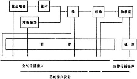從圖中可知,固體傳播噪聲是由傳遞中的振動激勵引起的,環板沖擊及輪齒嚙合振動通過軸、軸承、軸承座傳向箱體和機座;引起振動而輻射的噪聲通過箱壁向外輻射,此外,由軸的振動引起的噪聲的一部分直接向箱體外輻射。
