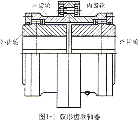 鼓形齒聯軸器(結構如圖1-1所示)是機械傳動的重要基礎部件,它是在直齒齒輪聯軸器基礎上為滿足大傾角、變化傾角、大傳遞轉矩、小尺寸、高可靠性等要求發展起來的。它已在冶金、采礦、化工、起重運輸等機械設備中廣泛應用[65-67]。尤其是在冶金設備中更是大量采用。如武鋼引進的一米七軋機系統中裝機量達2500套。國際上一些工業發達國家五十年代就有鼓形齒聯軸器的應用。我國近十幾年來從國外引進的成套和單機設備中大量采用了鼓形齒聯軸器。國內雖在六十年代開始在軋機主傳動上應用了鼓形齒聯軸器,但是設計制造技術落后,沒有廣泛推廣應用。近十幾年來,國內一些廠家為了滿足從國外引進設備的鼓形齒聯軸器的進口設備備件需要,通過消化吸收引進技術,進行批量仿制鼓形齒聯軸器,同時進行較深入的機理研究[69-79]。但未建立一套自己的完整合理的設計方法,制造技術也較落后。