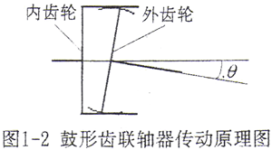 鼓形齒聯軸器傳動原理如圖1-2所示。鼓形齒聯軸器的內齒輪為一直齒內齒輪。外齒輪是齒頂面為一球面的鼓形齒輪。根據外齒輪齒面產生方式的不同,外齒輪又分為共軛齒面鼓形齒輪和非共軛齒面鼓形齒輪。由于鼓形齒輪加工工藝的關系,現使用的鼓形齒聯軸器多為非共軛齒面外齒輪的鼓形齒聯軸器。共軛齒面的鼓形齒齒面由與內齒輪共軛的加工方式產生;非共軛齒面的鼓形齒齒面相當于在不同端截面逐漸變位的一系列齒輪片相迭而成,變位量與軸向坐標形成的曲線稱為鼓度曲線。鼓度曲線是鼓形齒聯軸器特有的重要幾何參數,現所用的多為一段圓弧,也有用三段圓弧的,這些圓稱為位移圓。在圓弧鼓度曲線中,有位移圓中心在齒輪軸線上的,有不在軸線上的;有位移圓中心與齒頂球面中心重合的,也有不同中心的。鼓度曲線的設計無統一理論方法,通常是一經驗設計。究竟采用哪種曲線,有不同的考慮方面,總的待定要求是:(1)在軸間傾角處于最大時不出現棱邊接觸現象;(2)輪齒集中載荷越小越好,而齒面曲率與位移圓曲率成正比,因此位移圓半徑rg應盡可能大。鼓度曲線曲率半徑與內齒單側減薄量成正比關系,即它與齒的嚙合間隙有關,減薄量不足時可能造成干涉,減薄過多則削弱齒的強度且側隙太大。