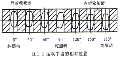 鼓形齒聯軸器的運動狀態是復雜的空間運動。現有資料均把它簡化為展開的平面運動進行分析,在有軸間傾角的狀態下,將運動分為齒的擺動運動和翻轉運動。這兩種運動在嚙合半周中經歷純擺動—復合運動—純翻轉—復合運動—純擺動的循環運動過程,如圖1-3所示。純擺動—純翻轉的相位差為90°。在非純擺動和純翻轉運動過程中,內外齒的相對運動是擺動運動和翻轉運動的復合運動[68]。顯然這種簡化分析方法是很粗略的,無法確切地描述空間嚙合狀態,但是它對于分析齒向位移、棱邊卡死現象及說明某一輪齒所處周向位置是有意義的。