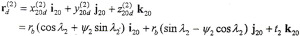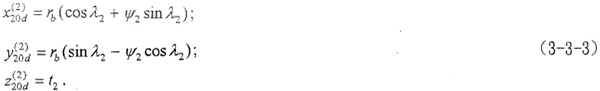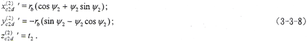 式中 ψ2、t2——曲面參變量;rb——漸開線基圓半徑。設(shè)α2為曲面某一點K處的壓力角,則有ψ2=tgα2。將(3-3-2)式轉(zhuǎn)換到S20坐標系,方程為