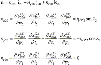 用與前述相同的方法可求得以t2、ψ2為參變量的外齒輪輪齒另一齒面的變形基本曲面方程為