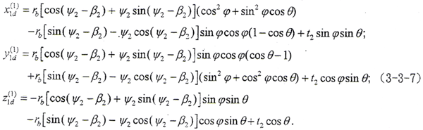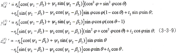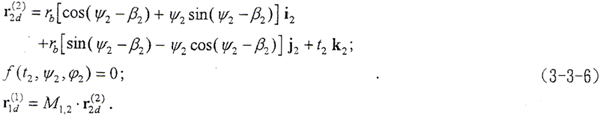 令φ1=φ2=φ,將M1,2、r2d(2)及f(t2,ψ2,φ2)=0解出的φ代入(3-3-6)的第三式,則可得到以t2、ψ2為參變量的外齒輪曲面的表達式。