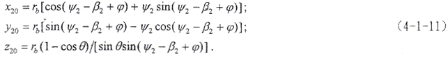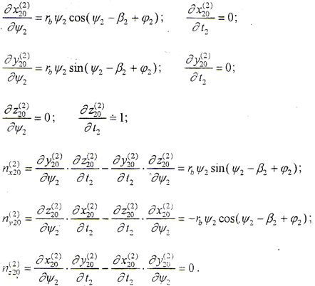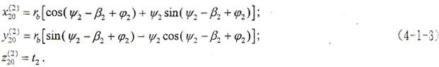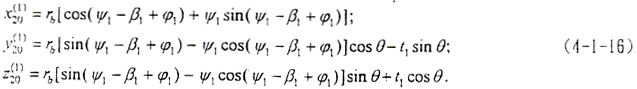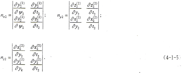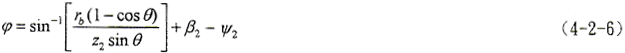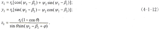 (4-1-9)式中,φ1、φ2為二齒面的轉角,令φ1=φ2=φ,將(4-1-2)式及由(4-1-8)式解出的t2代入(4-1-9)式,即可得到以ψ2、φ為參變量的外齒輪齒面方程。