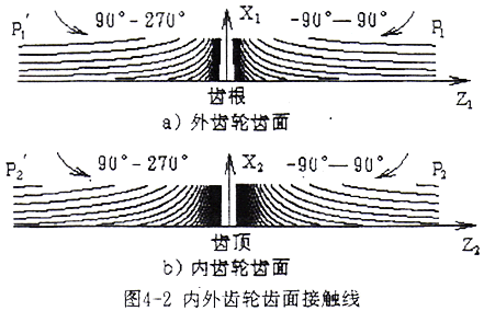 由(4-1-10)式和式(4-1-12)式通過計算,可以得到內外齒輪齒面上接觸線坐標,由計算出的坐標值即可繪出接觸線圖形。