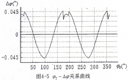 (2)以一對齒在一轉中始終嚙合為例計算分析可知,△φ的變化除在純翻轉區稍有波動外,總體約呈余弦規律變化,如圖4-5所示,這說明運動是非勻速的。當理論嚙合齒對在△φ為零的點嚙合時,與其相鄰的齒對若要嚙合,它的△φ值約為10-5弧度數量級;
