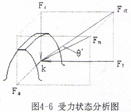 在接觸點K處,受力狀態如圖4-6所示。作用在外齒輪輪齒K點的總作用力為Fn,Fn可分解為切向力Ft,徑向力Fr和軸向力Fa。由圖4-6知