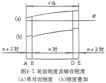 嚙合過程中,n對齒與n+2對齒交替嚙合,剛度疊加,如圖4-7(b)所示。由嚙合剛度的定義知