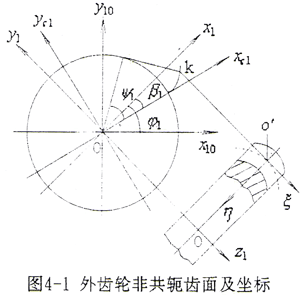 外齒輪齒面及坐標系如圖4-1所示。此處只討論在平行于端面的各截面上,為不同變位系數的漸開線外齒輪。