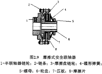 圖2.9 就是摩擦安全聯軸器的一種型式。工作時由主動軸帶動輪盤6,鏈輪3夾在兩摩擦片之間,摩擦片的壓緊力由壓板7,碟形彈簧4及調節螺母調節。如果傳遞的轉矩不大于摩擦片與鏈輪之間摩擦力所能產生的極限轉矩,鏈輪3 可通過雙排滾子鏈2將轉矩傳給半聯軸器鏈輪1(與被動軸聯接),實現扭矩的傳遞。