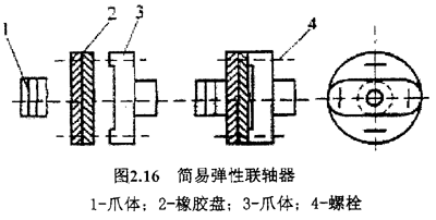 該聯軸器結構如下圖2.16所示,它是由一個彈性元件橡膠盤和兩爪體式半聯軸器三部分組成,半聯軸器同傳動軸配合聯接,兩半聯軸器又通過螺栓與橡膠盤聯接,也就是說兩半聯軸器的傳動是靠橡膠盤來傳遞的。這里所用的橡膠盤可用廢棄的4~5層的傳送帶自制,上面的4個孔用相應的膠皮鉆鉆出,目前這種簡易聯軸器可廣泛使用在一些設備上。