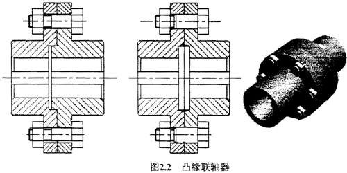 如圖2.2所示,凸緣聯軸器由兩個帶凸緣的半聯軸器和一組螺栓組成。這種聯軸器有兩種對中方式:一種是通過分別具有凸槽和凹槽的兩個半聯軸器的相互嵌合來對中,半聯軸器采用普通螺栓聯接;另一種是通過鉸制孔用螺栓與孔的緊配合對中,當尺寸相同時后者傳遞的轉矩較大,且裝拆時軸不必作軸向移動。
