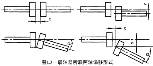 由于制造精度,安裝誤差,工作時軸的變形,軸承的磨損等原因,被聯接兩軸軸線不可避免的會出現一定的相對位移,分為徑向位移,軸向位移,角問位移以及綜合位移,如圖2.3所所示,在這種場合,應當使用移動式剛性聯軸器。依靠聯接元件間的相對可移動性來彌補被聯接兩軸安裝時的對中誤差,以及工作時的相對位移,避免或減少附加載荷: