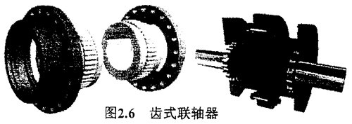 齒式聯軸器構造如圖2.6所示,主要由兩具有相同齒數的外齒軸套和兩帶有凸緣的內齒圈等零件組成。兩外齒軸套分別用鍵聯接固定在被聯接兩軸的軸端,兩內齒圈的內齒與軸套上的外齒相嚙合,其凸緣用螺栓聯接,從而實現兩軸的聯接。