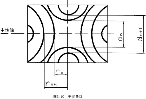 在干涉式測量系統中,輔助玻璃片與變形的試件表面間形成一層薄膜。當光源經擴束透鏡和半反透射鏡垂直照射時,入射光將在些薄膜上下表面反射,產生具有一定光程左的兩束相干光,產生一系列明暗交替的雙曲線,在計數顯微鏡中將觀察到雙曲線等厚干涉條紋,如圖3.10所示。