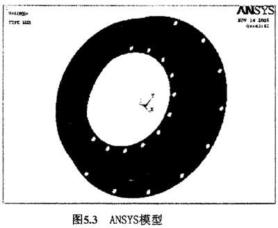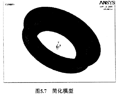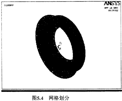 為了簡(jiǎn)化計(jì)算方法和節(jié)省計(jì)算用時(shí),首先對(duì)聯(lián)軸器的模型進(jìn)行簡(jiǎn)化。因?yàn)殍F圈上的螺孔的存在會(huì)大大的影響計(jì)算的復(fù)雜程度和時(shí)間,但對(duì)計(jì)算結(jié)果的影響卻微乎其微,所以決定建模時(shí)省略螺孔。簡(jiǎn)化后的模型網(wǎng)格劃分后如下圖5.7: