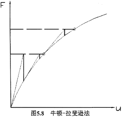 ANSYS程序應(yīng)用NR(牛頓-拉斐遜)法來(lái)求解非線性問(wèn)題.在這種方法中,載荷分成一系列的載荷增量.載荷增量施加在幾個(gè)載荷步.圖5.8說(shuō)明了非線性分析中的完全牛頓-拉斐遜迭代求法,共有2個(gè)載荷增量。