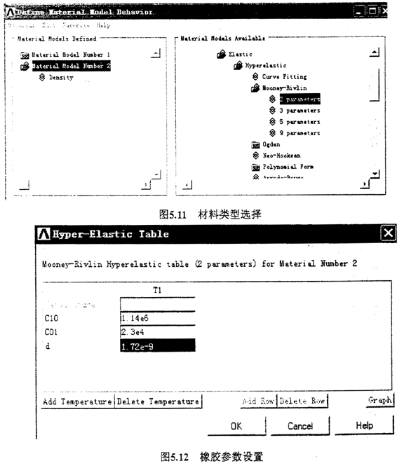 橡膠的硬度為70,通過(guò)計(jì)算確定C10和C01分別為1.14Mpa和0.023Mpa。ANSYS中參數(shù)設(shè)置如圖5.11和5.12所示,其中