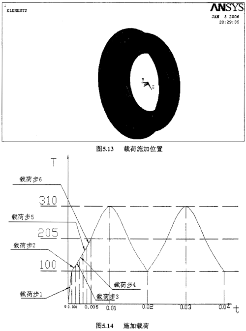 在小鐵圈端施加205-105cis314t的動(dòng)載荷,為了能夠清楚地看到動(dòng)態(tài)變化的過(guò)程,我們?nèi)蓚(gè)周期。在0.001秒施加第一個(gè)載荷,T1=100,迅速達(dá)到電動(dòng)機(jī)工作狀態(tài)。對(duì)于正紡載荷,將每四分之一周期劃分成五小段,每一個(gè)小段作為1個(gè)載荷步,一共可分為20個(gè)載荷步。載荷點(diǎn)和施加過(guò)程如圖5.13和圖5.14所示: