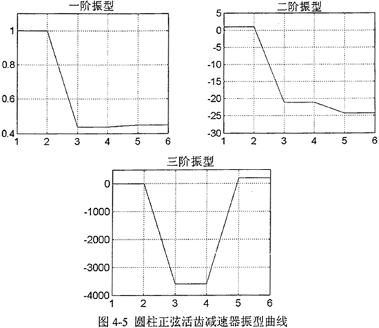 根據式(4-9)、(4-10)及(4-12)計算出固有頻率、勢能分布率和模態柔度見表4-2。利用Matlab編制程序還繪制出圖4-5所示的減速器系統的振型曲線。