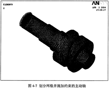 四面體單元每個節點有三個自由度(Tx,Ty,Tz),通過限制節點的自由度,對模型施加約束。模擬軸承的作用,在安裝軸承處的零件表面施加約束,首先將表面上所有節點的坐標由笛卡爾坐標(x,y,z)轉換為柱坐標(R,θ,Z),然后限制自由度R。并在主動軸的輸入軸端面和導架的輸出軸端面,限制所有節點的自由度。劃分網格并施加約束的主動軸見圖4-7。