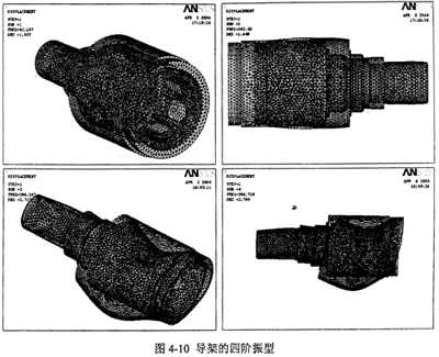 選擇Subspace特征值求解器,指定擴展模態數為4,頻率范圍為0~1000Hz。求得輸入軸的前四階固有頻率為101.SHz、207.2Hz、660.6Hz、661.2Hz,對應的振型見圖4-8。一階振型為繞z軸扭轉,二階振型為沿z軸軸向拉伸,三階振型為在xoz平面彎曲,四階振型為在yoz平面彎曲。