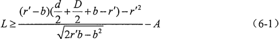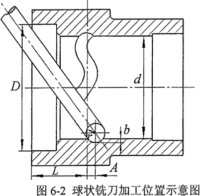 由于球狀銑刀的刀刃部分為半球頭形狀,為避免球頭銑刀的刀柄與殼體內(nèi)壁發(fā)生干涉,導(dǎo)致內(nèi)空間正弦滾道被銑削出平面,則空間正弦曲線的平衡位置到殼體端面的距離L應(yīng)滿足一定的條件,由圖6-2中各參數(shù)的關(guān)系,可以得到