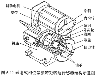 圖6-11為磁電式相位差型轉(zhuǎn)矩轉(zhuǎn)速傳感器的結(jié)構(gòu)示意圖,它由機(jī)座、端蓋、扭力軸、內(nèi)齒輪、外齒輪、磁鋼、線圈軸承等組成。內(nèi)齒輪、磁鋼固定在套筒上,線圈固定在端蓋上,外齒輪固定在扭力軸上,當(dāng)內(nèi)外齒輪發(fā)生相對(duì)轉(zhuǎn)動(dòng)時(shí),由于磁通不斷變化,在線圈中便感應(yīng)出近似正弦波的感應(yīng)電勢(shì)ul、u2,兩感應(yīng)電勢(shì)的初始相位差是恒定的,考慮到正反加載,φ0設(shè)計(jì)在大約180°位置上,當(dāng)加上扭力時(shí),扭力軸發(fā)生扭轉(zhuǎn)變形,在彈性范圍內(nèi)外加扭矩與機(jī)械扭轉(zhuǎn)角成正比,這時(shí)ul、u2訊號(hào)的相位差要發(fā)生變化,即