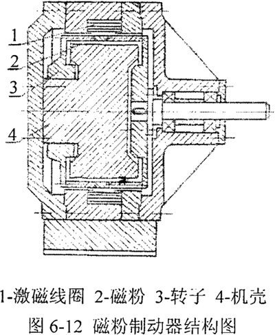 采用磁粉制動(dòng)器作為試驗(yàn)的加載裝置。磁粉制動(dòng)器由轉(zhuǎn)子、機(jī)殼、激磁線圈、磁粉組成,其結(jié)構(gòu)如圖6-12所示。在激磁線圈不通電流時(shí),不產(chǎn)生磁通,磁粉呈自由狀態(tài)。當(dāng)軸轉(zhuǎn)動(dòng)時(shí),由于離心力的作用,使磁粉散布在轉(zhuǎn)動(dòng)件與機(jī)殼之間,若此時(shí)激磁線圈通電流,則在線圈周?chē)a(chǎn)生磁場(chǎng),轉(zhuǎn)動(dòng)件與機(jī)殼間的磁粉沿磁通方向連接成鏈狀,由于磁粉間的結(jié)合力,使工作面之間產(chǎn)生摩擦力,從而形成制動(dòng)力矩,起到加載的作用。該力矩與激磁電流的大小基本成正比,故通過(guò)調(diào)節(jié)激磁線圈的電流大小可在一定范圍內(nèi)改變制動(dòng)力矩的大小。
