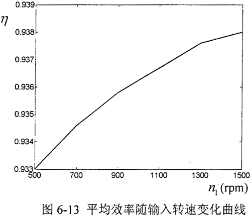 同樣方式測(cè)得當(dāng)輸入轉(zhuǎn)速分別為700rpm、900 rpm、1100 rpm、1300 rpm、1500 rpm時(shí),減速呂樣機(jī)的平均效率隨輸入轉(zhuǎn)速變化曲線如圖6-13。通過(guò)測(cè)試結(jié)果表明,在低中速情況下,減速器的傳動(dòng)效率受其轉(zhuǎn)速的影響不明顯,由于此時(shí)潤(rùn)滑脂溫度較低,隨著轉(zhuǎn)速的增加,減速器的傳動(dòng)效率略有提高,其平均值在93%以上,由引說(shuō)明本文設(shè)計(jì)的減速器具有較高的傳動(dòng)效率。