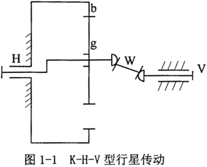 本文所研制的兩級三環減速器屬漸開線少齒差傳動形式,有必要重點討論一下漸開線少齒差行星齒輪傳動。當漸開線內嚙合圓柱齒輪副的內齒輪和外齒輪齒數差很少時(一般為1~4個)所組成的行星齒輪機構,稱為少齒差行星齒輪傳動。如圖1-l所示的K-H-V型(也稱N型)是其主要形式,K-H-V型傳動,其內齒圈b固定,轉臂H是輸入軸。由于它的轉動和內齒圈的限制,行星輪g作平面運動,即行星輪既繞內齒圈軸線作圓周平移運動,又繞自身軸線作回轉運動,再用輸出機構W把行星輪的回轉運動傳遞給輸出軸,從而起到減速作用。