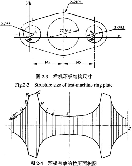 三環減速機運動屬靜不定問題,用一般平面剛體力學方法無法完全求出機構的作用力,影響到三環減速器設計和傳動性能的改進。為此需要考慮各構件的變形,建立能充分反映三環減速器實際受力的變形協調條件作為補充方程。三環減速機傳動機構是雙曲柄連桿機構,曲柄的旋轉半徑是偏心軸的偏心距,曲柄布置在由支撐軸承支承的偏心軸上,環板是雙曲柄機構的連桿,傳動過程中的主要變形有各構件的接觸變形、軸的扭轉彎曲變形、環板的拉壓變形等等。根據位移變形分析可知,軸的彎曲變形和環板的拉壓變形是主要的變形形式。對于筆者設計的如圖2-3所示的環板,設A為輸入軸,B為輸出軸。為了計算上的方便,以前將其簡化為等截面桿處理。實際上,由于有效截面的最大面積是最小截面面積的5倍多,這種簡單地處理和實際有較大的差別。環板受拉壓變形時的有效拉壓面積的形狀如圖2-4所示(單位:mm)。