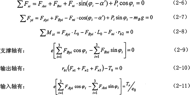 由上式可看出,任意時刻各環板上作用的嚙合力是不相等的,且是與轉角、環板和曲柄軸結構尺寸、壓力角以及偏心尺寸有關的復雜函數,假設各嚙合力相等或者是成一簡單的函數關系都是與實際嚴格不符的。若需要用簡潔的函數關系加以描述,應首先利用上式求出輸出軸旋轉一周時的數個嚙合力的表達式,這里不作詳細的討論。